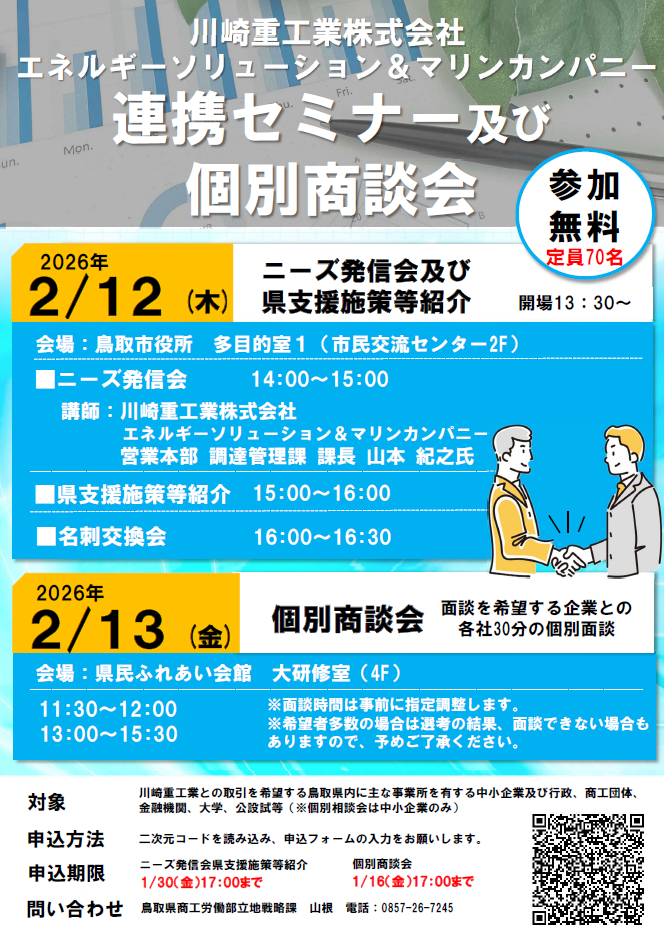 川崎重工業㈱エネルギーソリューション&マリンカンパニーと 鳥取県の連携セミナー及び個別商談会